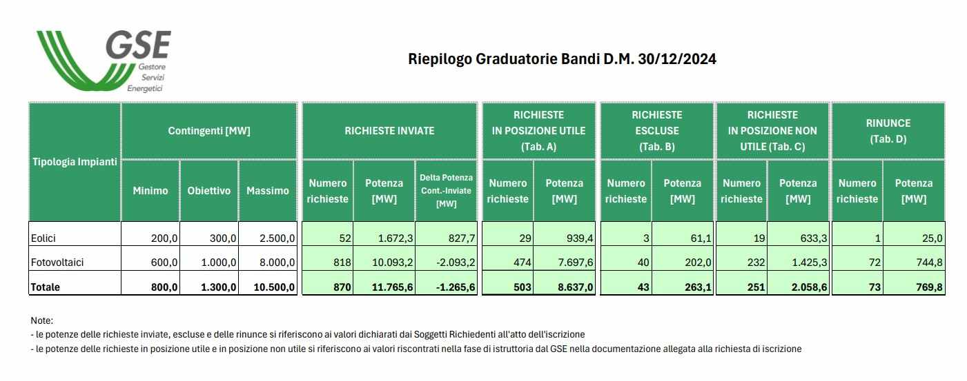 Di seguito la tabella riepilogativa con evidenza, del contingente di potenza disponibile, del numero e della potenza degli impianti iscritti e ammessi in posizione utile oltre alle curve di domanda e di offerta per ciascuna tipologia di impianto.